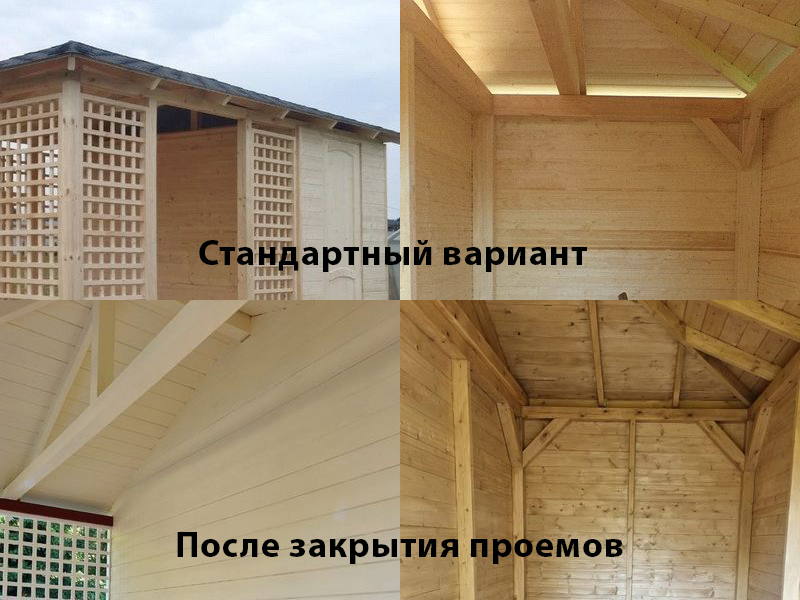 Стандартно беседка с хозблоком идет с проемами под крышей, между беседкой и хозблоком и хозблоком и улицей. Стоимость работ зависит от размеров беседки. Данная цена указана за работу беседки размерами 3х5 метров.