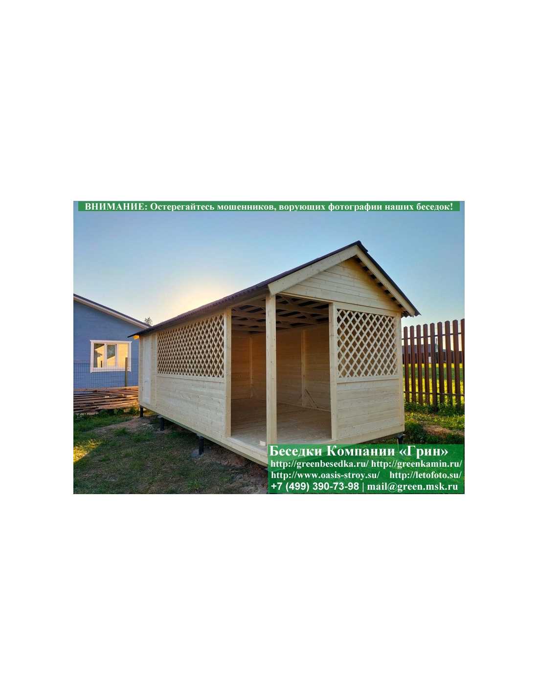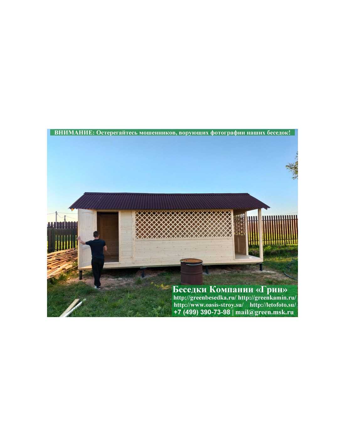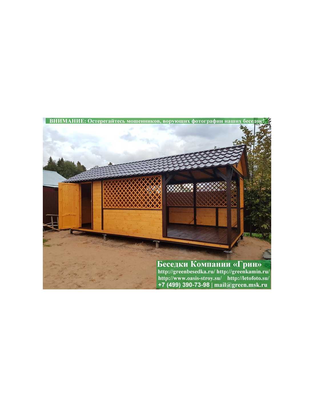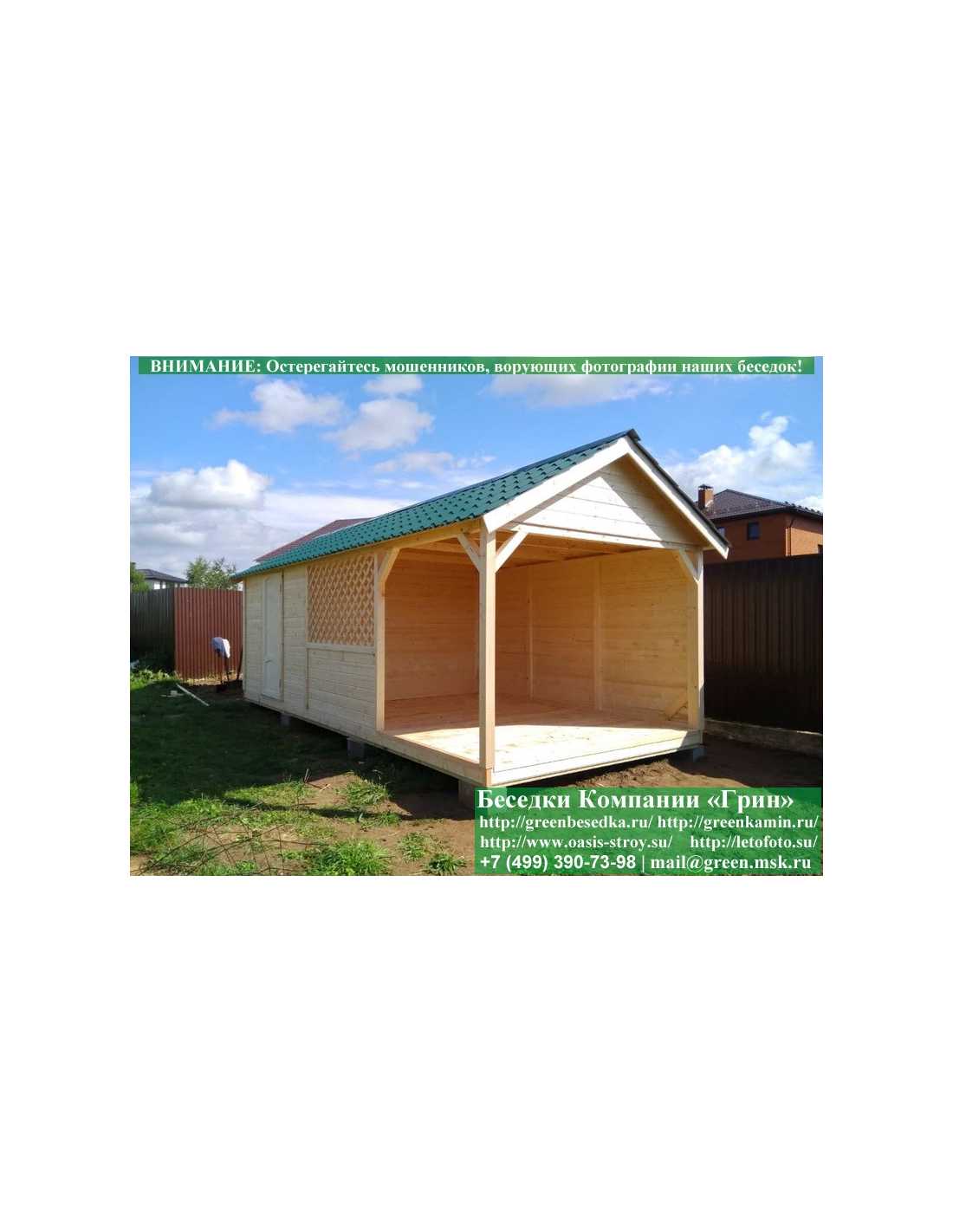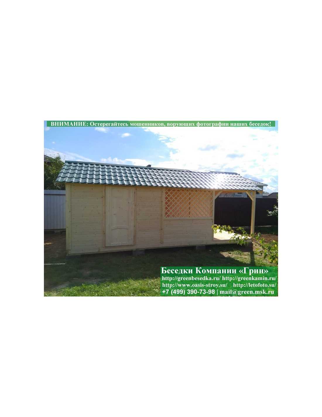 Полузакрытая беседка с хозблоком, сараем 3х7 метров изготавливается из сосны. При строительстве беседок используется сухой материал камерной сушки. Беседка разделена на 2 части: Полузакрытая беседка 5х3 метра и хозблок 2х3 метра (можно сделать 4х3 +3х3). При строительстве беседок используется сухой материал камерной сушки. В качестве каркаса используется очень надежная имитация бруса 17х140 мм. В отличие от вагонки она не гнется, не набухает и не идет трещинами. В качестве несущих стоек используется строганый брус, по углам 90х90 мм. На крышу беседки укладывается ондулин: Коричневых, Зеленых и Бордовых цветов. Срок изготовления и монтажа беседки на участке составляет 5-10 дней. Беседки поставляются в не крашеном виде. Возможна покраска беседок краской, лаком или обработка цветным антисептиком (дешевый вариант). Дополнительно предлагаем установку в деревянные беседки недорогих безопасных быстровозводимых печей-барбекю, установка в течение дня, или более дорогих и сложных комплексов-барбекю и мангалов-барбекю из кирпича.