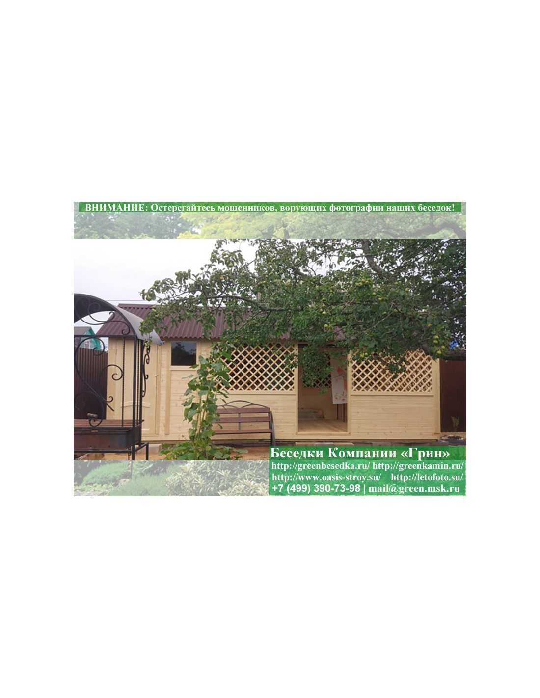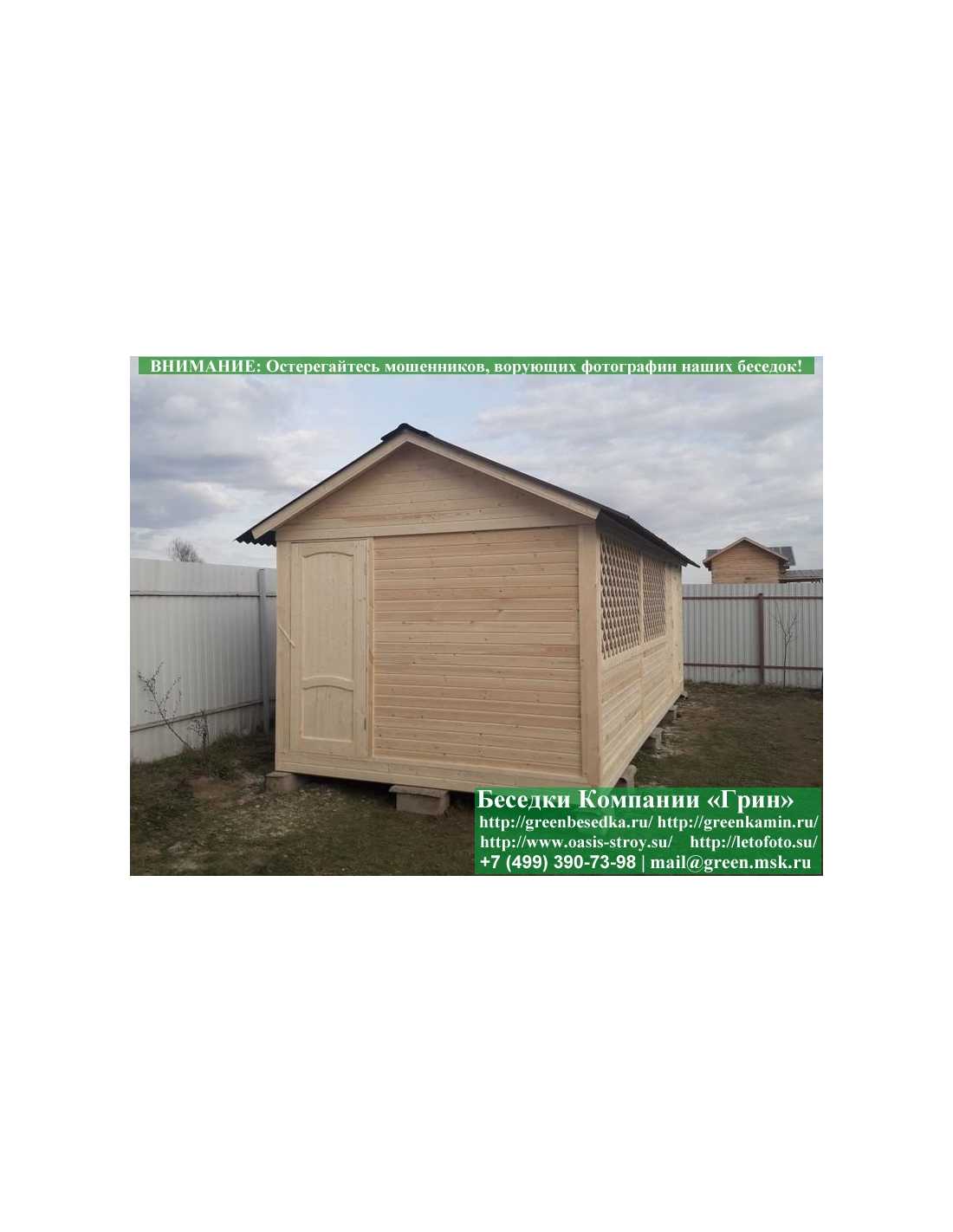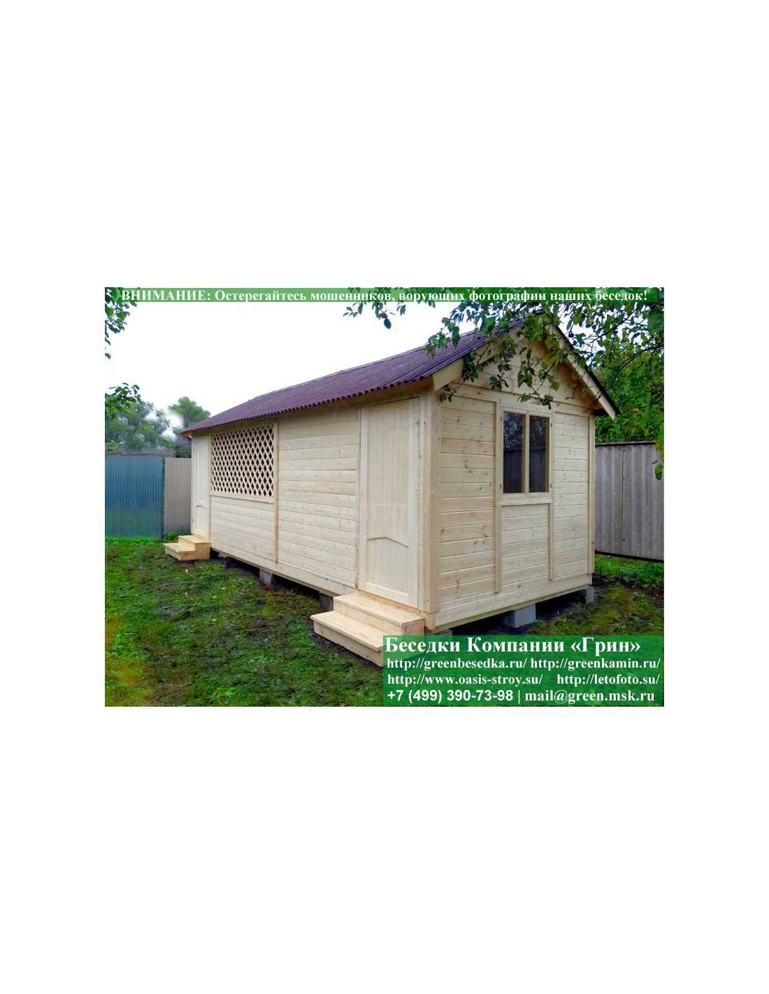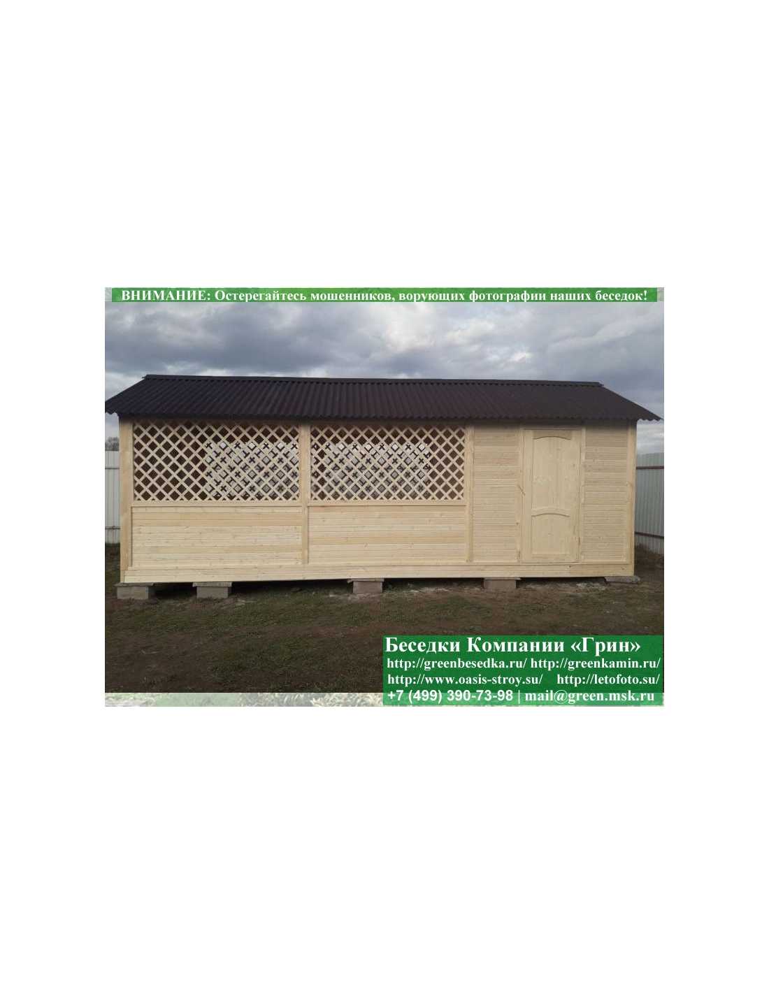 Закрытая садовая беседка с хозблоком, сараем 3х7 метров изготавливается из сосны. При строительстве беседок используется сухой материал камерной сушки. Беседка разделена на 2 части: Полузакрытая беседка 5х3 метра и хозблок 2х3 метра (можно сделать 4х3 +3х3). При строительстве беседок используется сухой материал камерной сушки. В качестве каркаса используется очень надежная имитация бруса 17х140 мм. В отличие от вагонки она не гнется, не набухает и не идет трещинами. В качестве несущих стоек используется строганый брус, по углам 90х90 мм. На крышу беседки укладывается ондулин: Коричневых, Зеленых и Бордовых цветов. Срок изготовления и монтажа беседки на участке составляет 5-10 дней. Беседки поставляются в не крашеном виде. Возможна покраска беседок краской, лаком или обработка цветным антисептиком (дешевый вариант). Дополнительно предлагаем установку в деревянные беседки недорогих безопасных быстровозводимых печей-барбекю, установка в течение дня, или более дорогих и сложных комплексов-барбекю и мангалов-барбекю из кирпича.