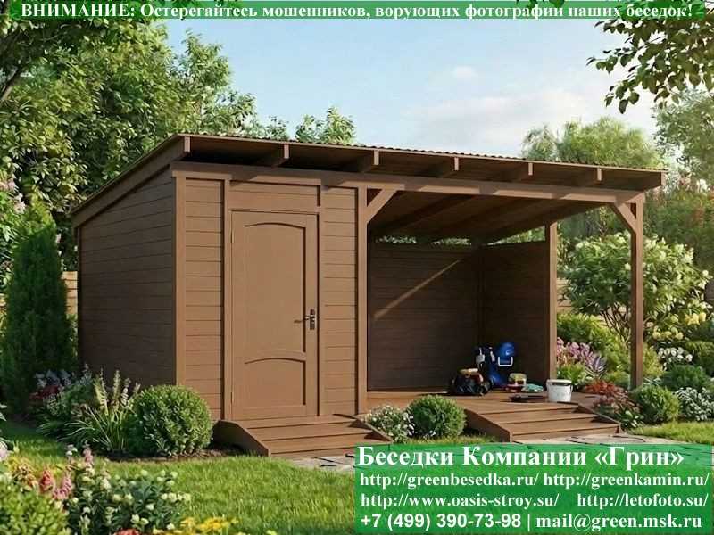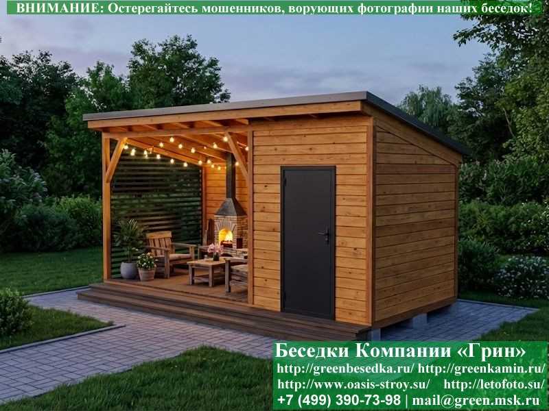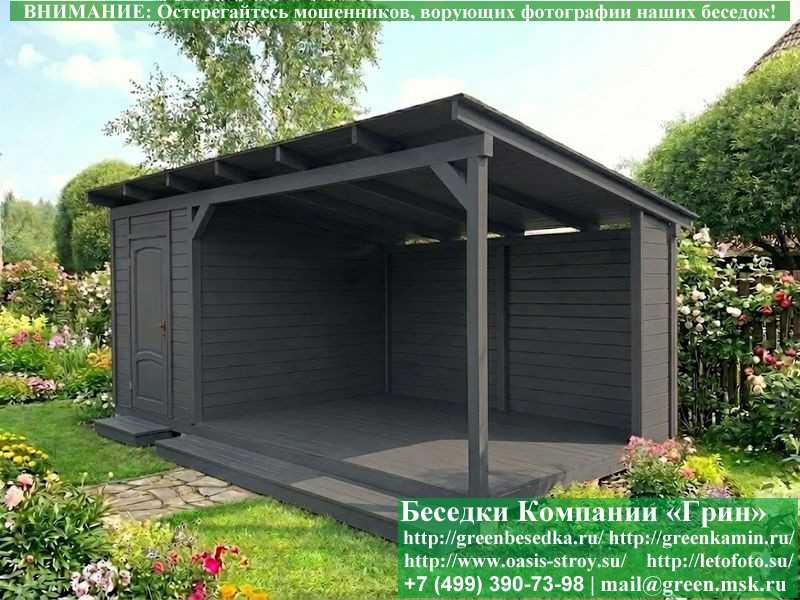 Беседка в стиле 'Лофт' 3х5, 3х6 метров изготавливается из сосны, с односкатной крышей. При строительстве беседок используется сухой материал камерной сушки. Беседка разделена на 2 части. Хозблок 2х3 метра. Открытая веранда 3х3 или 3х4 метра. Возможно изменить конфигурацию. Сделать хозблок 3х3 метра. Беседка устанавливается на фундаментные блоки 20х20х40 см. Они включены в цену. Их можно дополнительно заменить на металлические сваи. На пол кладется толстая сухая строганая доска 35 мм. В качестве несущих стоек используется строганый брус 90х90 мм. В качестве каркаса глухих стен используется очень надежная имитация бруса 17х140 мм. На крышу укладывается мягкая гибкая черепица "Технониколь": коричневых, зеленых, бордовых, серых цветов. Мягкую черепицу можно заменить ее на металлочерепицу или профлист. Срок изготовления и установки беседки на участке составляет 5-10 дней. Беседки поставляются в не крашеном виде. Возможна покраска беседок или дополнительная обработка антисептиком. Дополнительно предлагаем установку в деревянные беседки 'Лофт' недорогих безопасных быстровозводимых печей-барбекю, установка в течение дня, или более дорогих и сложных комплексов-барбекю и мангалов-барбекю из кирпича.