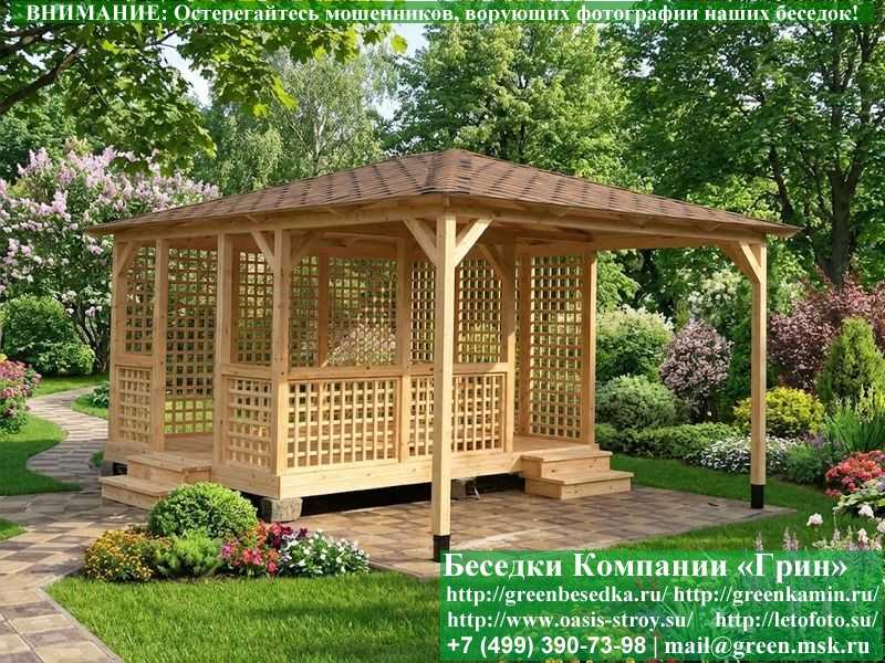 Красивая летняя деревянная беседка с навесом для дачи, загородного дома 4х5 метров. Фото и цены. В интернет-магазине 'Беседки-Экон' вы можете купить элегантную летнюю беседку с навесом из дерева для дачи, сада, отдыха 4х5 под ключ с монтажом в Твери и Тверской области. Изготовление и строительство интересных летних деревянных беседок с навесом по готовым проектам размерами 4х5 метров возможно так же в Москве, Московской, Калужской, Владимирской, Рязанской, Ярославской, Костромской, Брянской, Смоленской, Ржевской, Орловской, Ивановской, Тульской, Новгородской, Липецкой, Ленинградской и некоторых других областях.