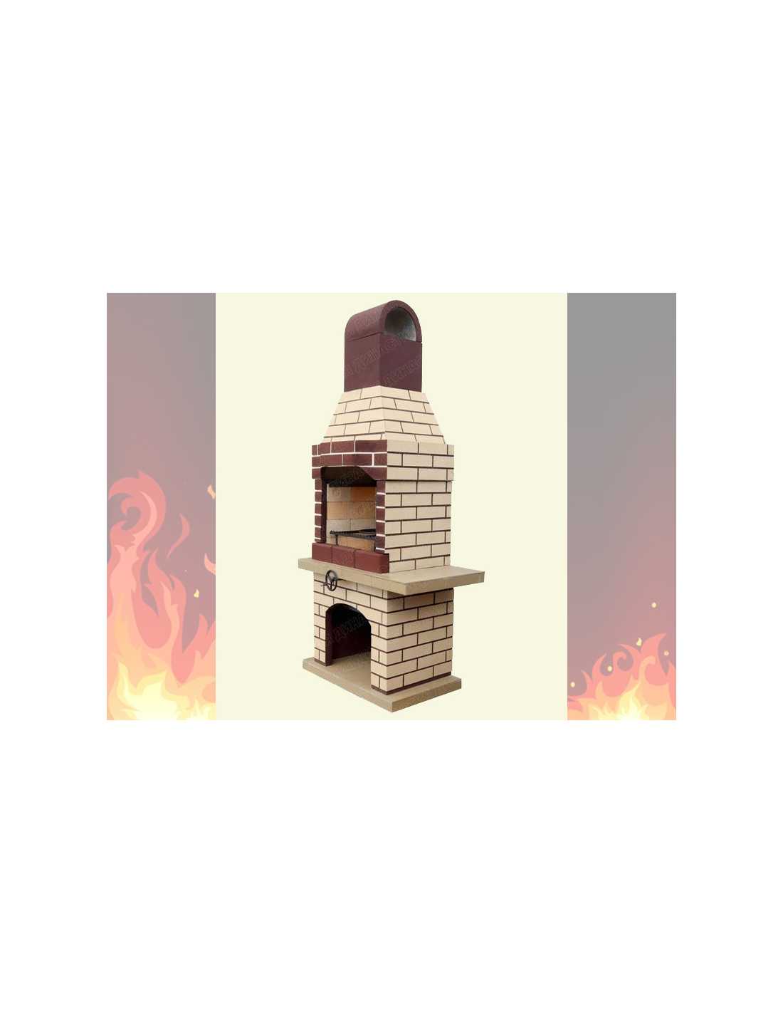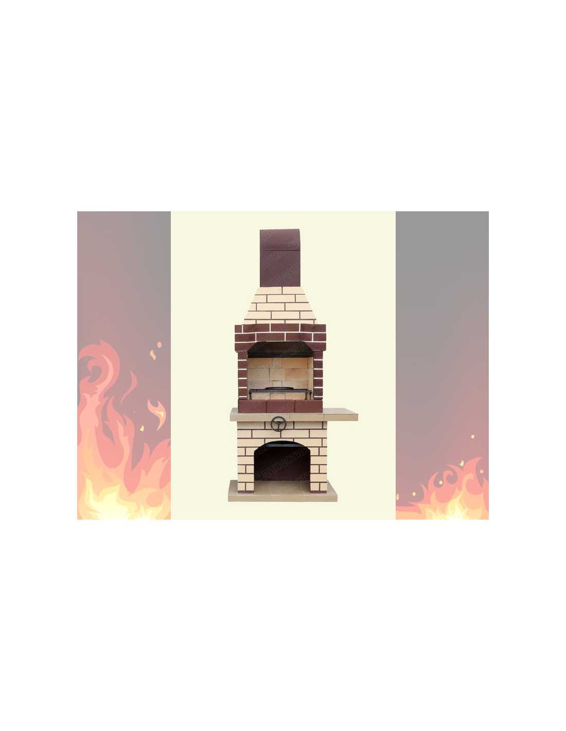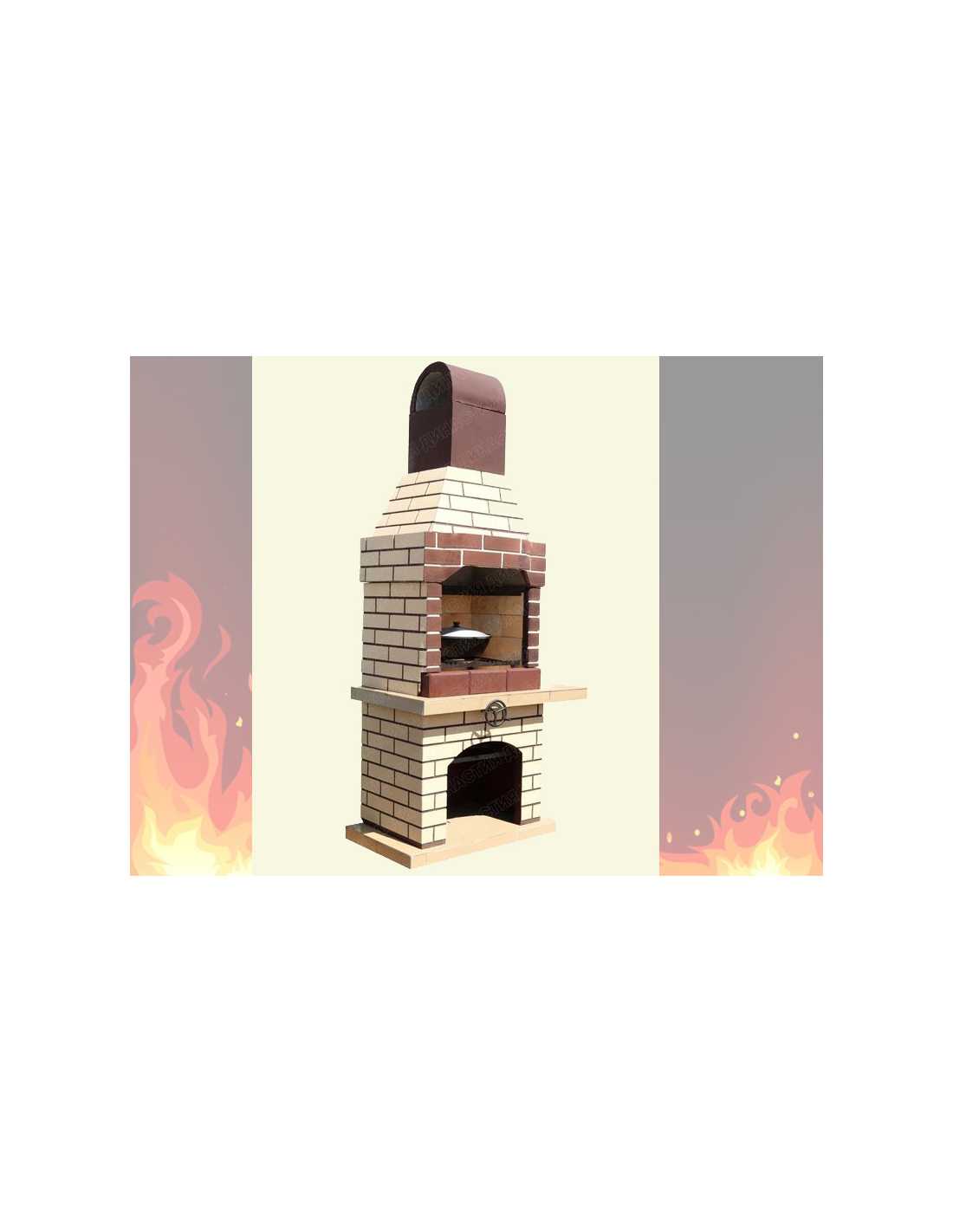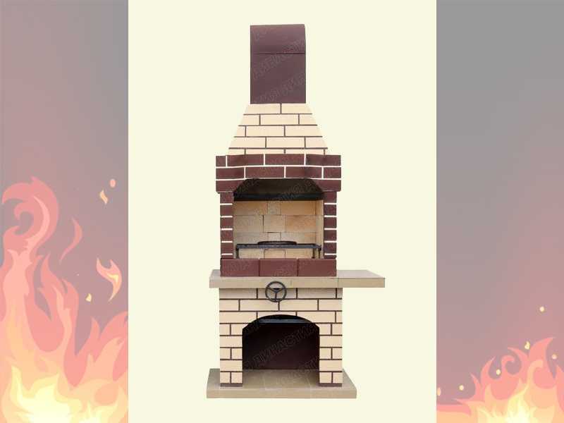 Печь барбекю покрашена фасадной краской, столешница и нижняя подушка облицованы керамической плиткой.Выполнена из огнеупорного кирпича и армированного бетона. Снизу предусмотрено место для дров.Топливо: уголь и дрова.