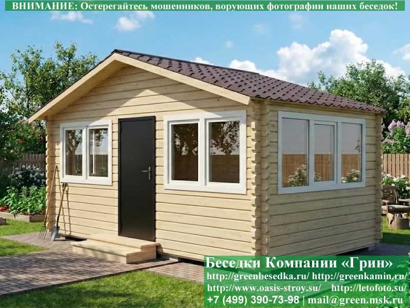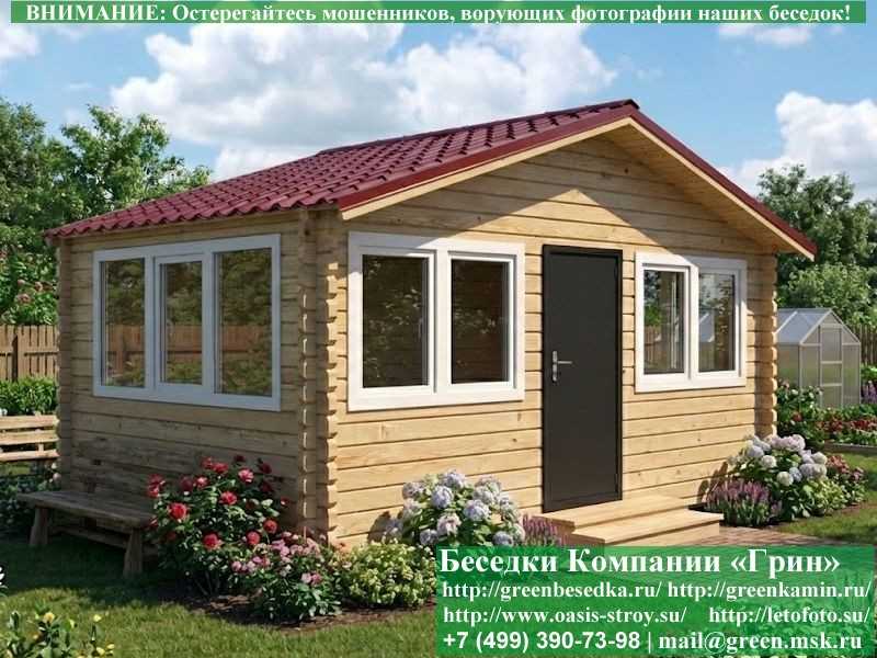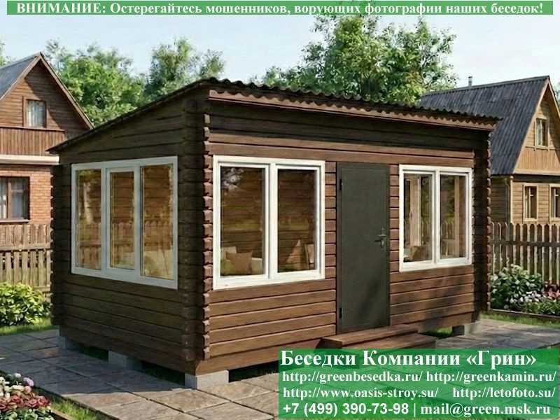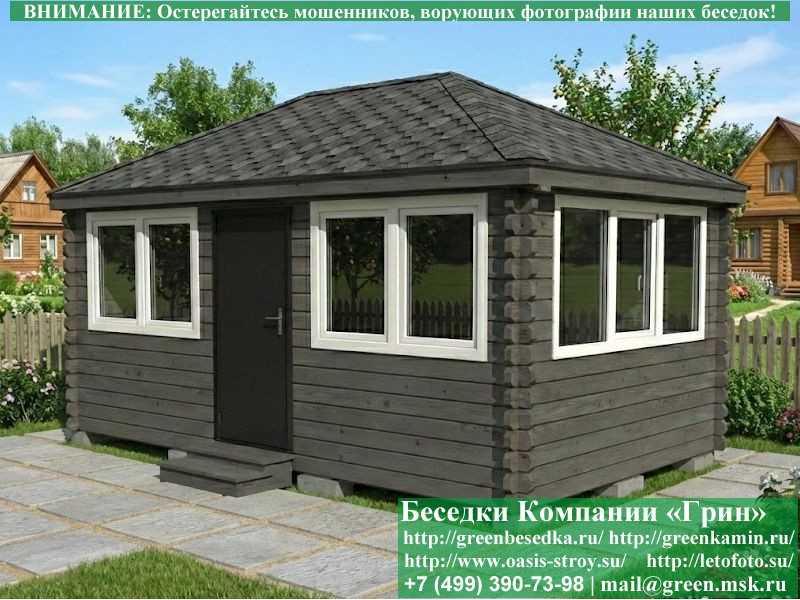 Беседка для загородного дома 3х4Застекленная беседка из минибруса 3х5 метров изготавливается из хвойных пород дерева. При строительстве беседок используется сухое дерево камерной сушки. Стенки беседки изготавливаются из сухого профилированного бруса 45х145 и 60х145 мм. На пол кладется толстая сухая строганая доска 35 мм. В беседку устанавливаются однокамерные пластиковые окна фирмы "Века". Окна заказываются в Лемана-Про. Количество застекленных сторон и количество открывающихся окон обговаривается дополнительно. Устанавливается металлическая или алюминиевая дверь. Беседки изготавливаются с Односкатной, 2-х и 4-х скатной крышей. На крышу кладется Металлочерепица, Мягкая черепица или Профлист: Коричневых, Зеленых, Бордовых, Серых цветов. Срок изготовления и установки беседки на участке составляет 10-14 дней (срок изготовление пластиковых окон). Беседки поставляются в не крашеном виде. Возможна покраска беседок в цеху или полная обработка антисептиком. Дополнительно предлагаем установку в деревянные беседки с пластиковыми окнами недорогих безопасных быстровозводимых печей-барбекю, установка в течение дня, или более дорогих и сложных комплексов-барбекю и мангалов-барбекю из кирпича.